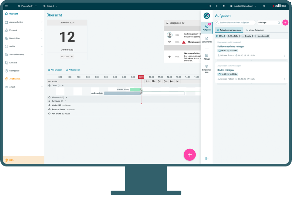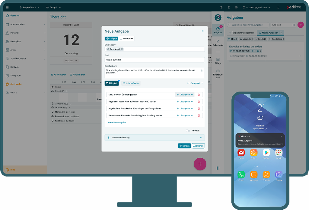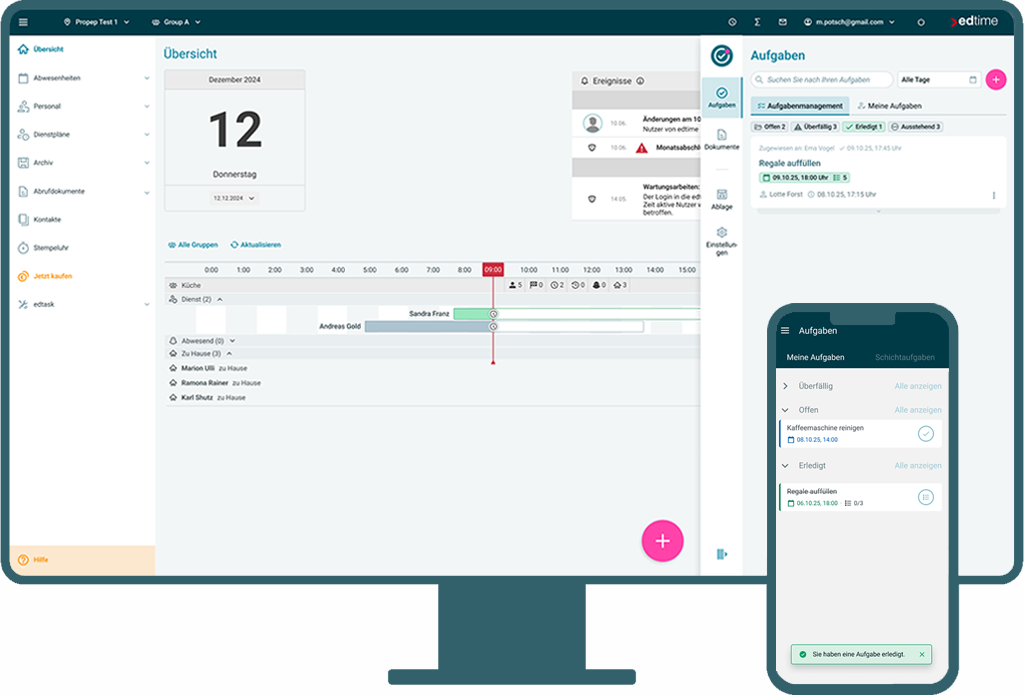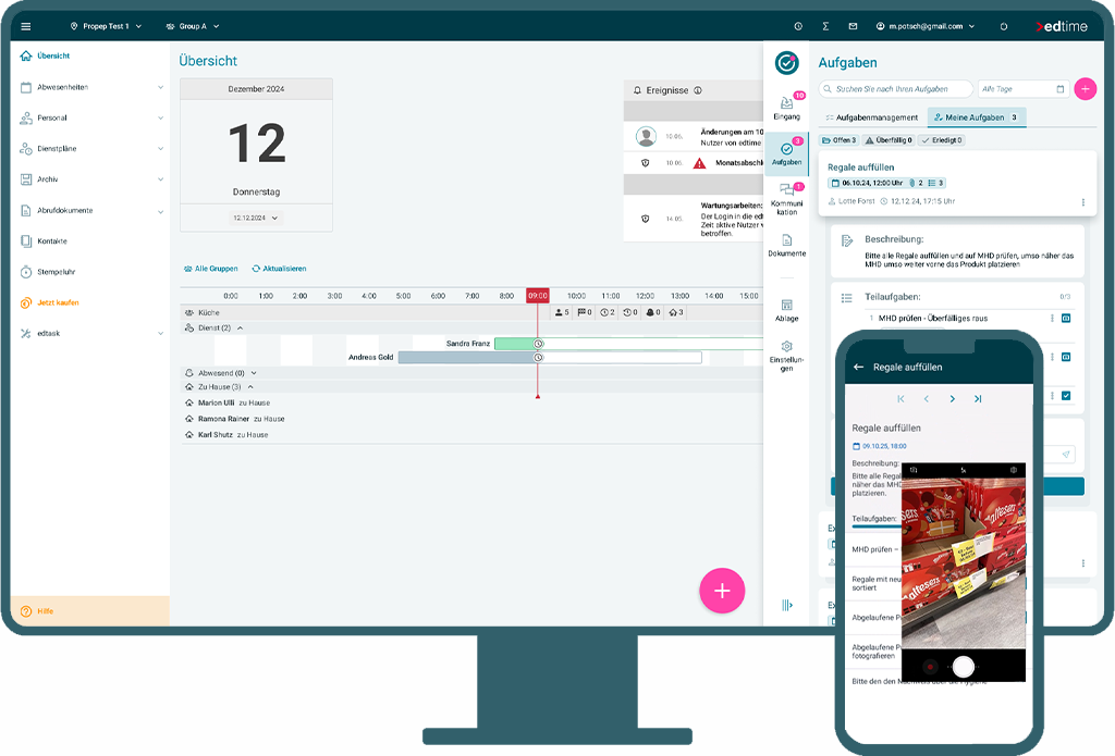Das Aufgabenmanagement von edtime sorgt für klare Abläufe, schnelle Rückmeldungen und volle Transparenz. Aufgaben werden eindeutig zugewiesen, mobil erledigt und in Echtzeit nachverfolgt. Dieses strukturierte Task-Management spart wertvolle Zeit, vermeidet Missverständnisse und ermöglicht jederzeit einen lückenlosen Überblick über alle Prozesse. Einfach, übersichtlich und perfekt auf die Anforderungen des modernen Betriebsalltags zugeschnitten.