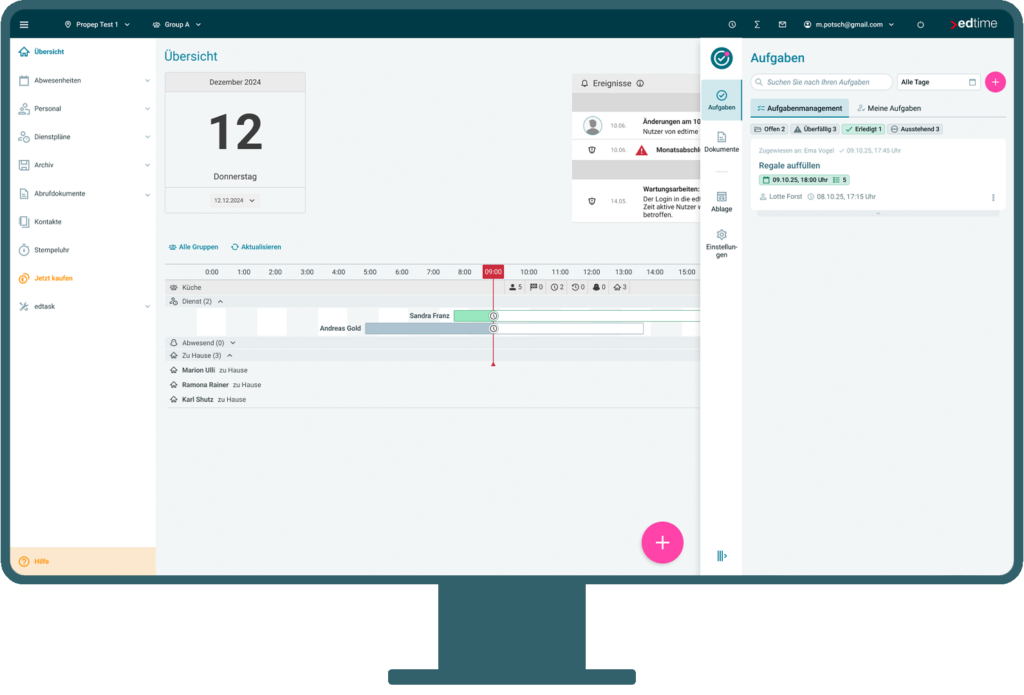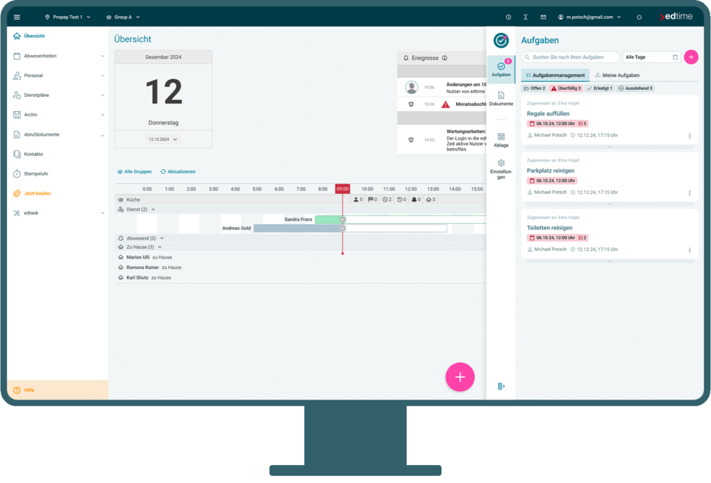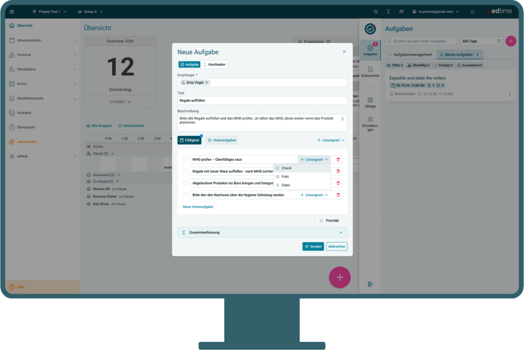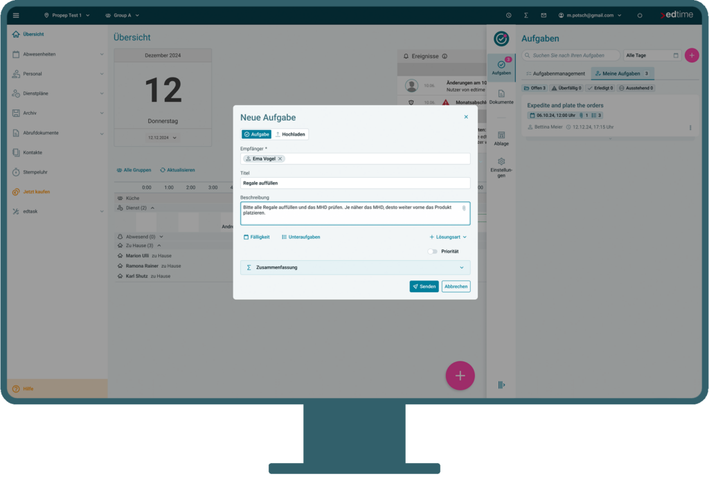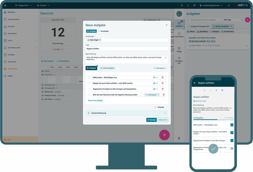 Das Aufgabenmanagement von edtime sorgt für klare Abläufe, schnelle Rückmeldungen und volle Transparenz. Aufgaben werden eindeutig zugewiesen, mobil erledigt und in Echtzeit nachverfolgt. Dieses strukturierte Task-Management spart wertvolle Zeit, vermeidet Missverständnisse und ermöglicht jederzeit einen lückenlosen Überblick über alle Prozesse. Einfach, übersichtlich und perfekt auf die Anforderungen des modernen Betriebsalltags zugeschnitten.